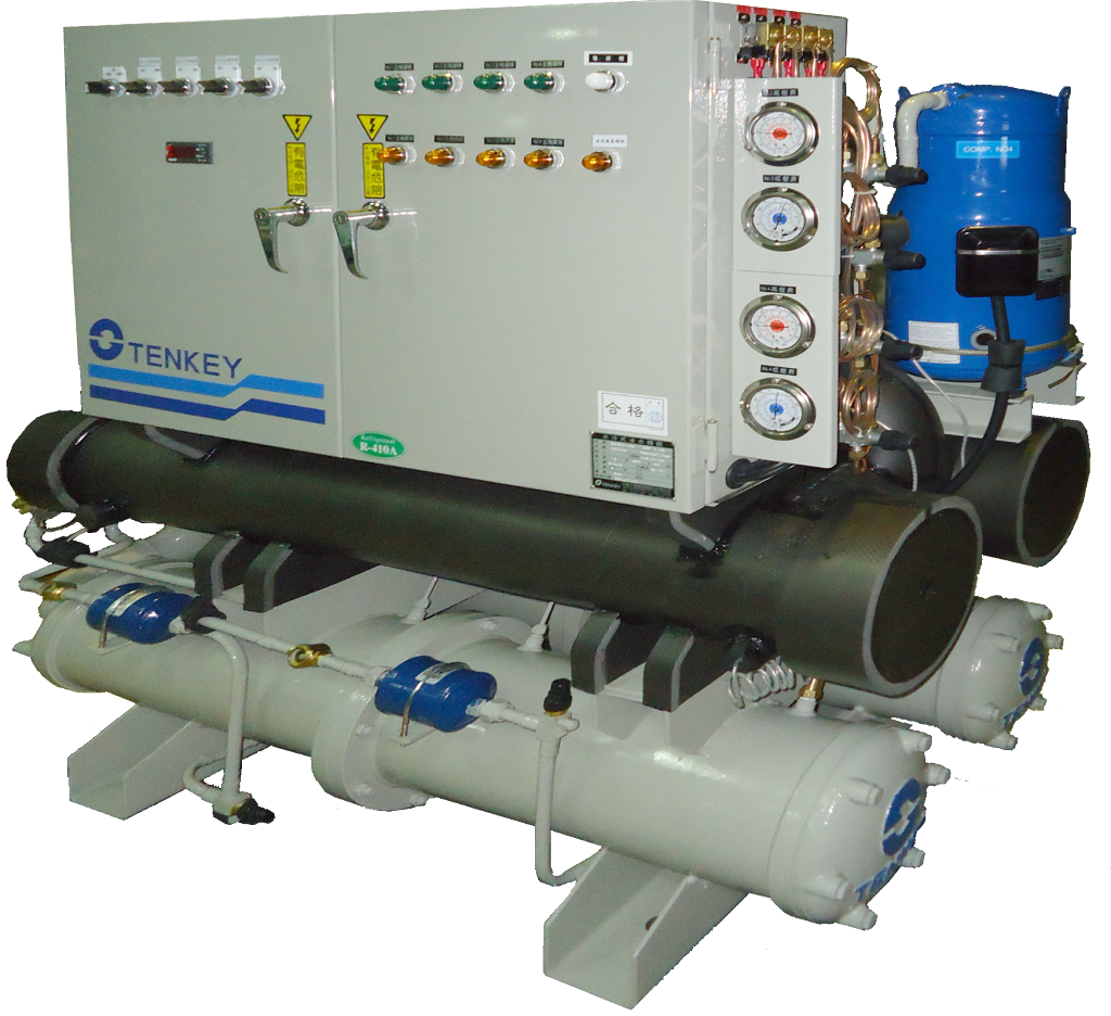 天基全密渦卷水冷直膨式冰/滷水機組,構造簡單,性能穩定,體型精巧,適用條件廣。機組冷凍能力自26KW~210KW (約8RT~60RT)。透過多組壓縮機並聯冷媒系統迴路設計,搭配變頻控制等方式,可依實際工況隨意調整負載,同時確保安全性及經濟性。淺顯易懂的人機操作介面,讓一般維護人員也能輕易的進行監控、記錄、操作、故障排除等動作,大幅減少人員的訓練成本與時間。