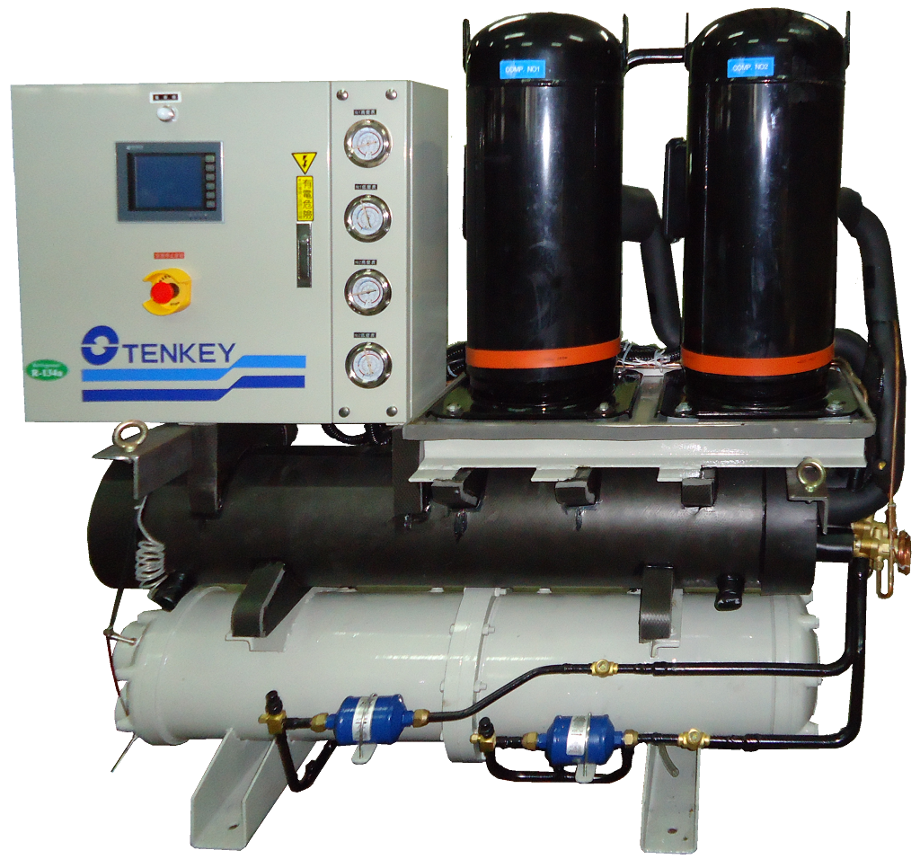 天基全密渦卷水冷直膨式冰/滷水機組,構造簡單,性能穩定,體型精巧,適用條件廣。機組冷凍能力自26KW~210KW (約8RT~60RT)。透過多組壓縮機並聯冷媒系統迴路設計,搭配變頻控制等方式,可依實際工況隨意調整負載,同時確保安全性及經濟性。淺顯易懂的人機操作介面,讓一般維護人員也能輕易的進行監控、記錄、操作、故障排除等動作,大幅減少人員的訓練成本與時間。